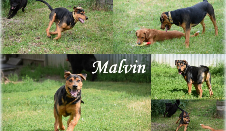 Malvin je šestiměsíční kříženec pravděpodobně rotvajlera, který se našel jako třídenní štěně loni v prosinci. Bohužel se k nám 5. května vrátil z osvojení, kvůli údajné agresivitě, kdy osvojitelé nezvládli výchovu štěněte. Z počátku byl hodně vystrašený a měl tendenci nás všechny sežrat, teď už je však s námi všemi největší kamarád a bezstarostné štěně. Na procházkách umí chodit na vodítku, netahá a chce poslouchat, jen ho zatím pořádně nikdo nic moc nenaučil. Potřeboval by najít pánečka, který mu věnuje péči a lásku, zároveň však i pevnou ruku a výcvik, a vychová z něj správného psího parťáka.