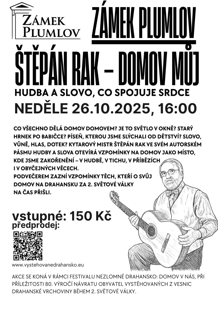 Kytarový mistr Štěpán Rak ve svém autorském pásmu hudby a slova otevírá vzpomínky na domov jako místo, kde jsme zakořenění – v hudbě, v tichu, v příbězích i v obyčejných věcech. Podvečerem zazní i slova těch, kteří o svůj domov na Drahansku za 2. světové války na čas přišli. Jejich vzpomínky zaznamenala historička Dana Vedra z Moravského zemského muzea.