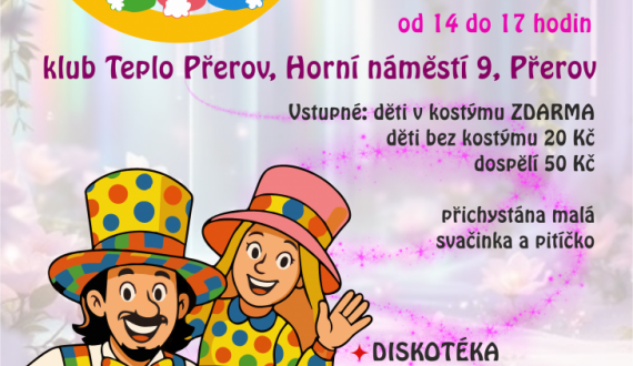 Zábavný maškarní ples s Elou a Tomem. Program pro děti plný her, soutěží a písniček. Vstupné 50/20 Kč, děti v kostýmu zdarma.