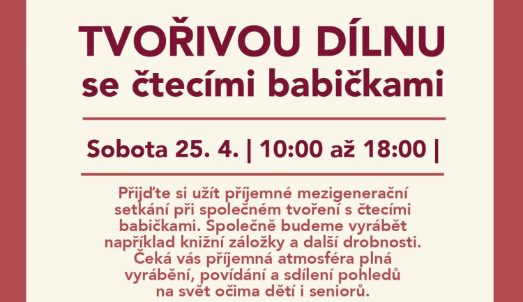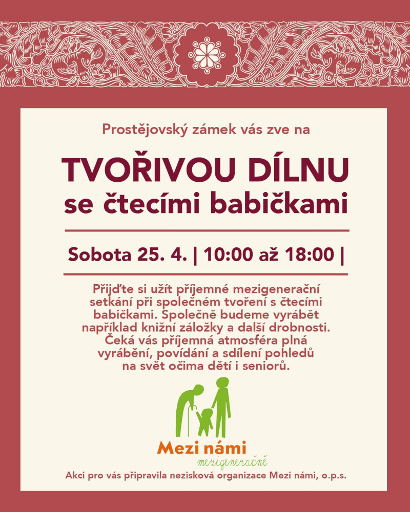 Zveme Vás na tvořivou dílnu se čtecími babičkami, která nabídne příjemné mezigenerační setkání plné kreativity a sdílení. Návštěvníci si mohou vyzkoušet výrobu drobných kreativních předmětů, např. knižních záložek a dalších dekorací. Tvořivá dílna je vhodná pro děti i pro dospělé, kteří chtějí strávit příjemný čas na zámku. Akci si pro vás připravila nezisková společnost Mezi námi, o.p.s.