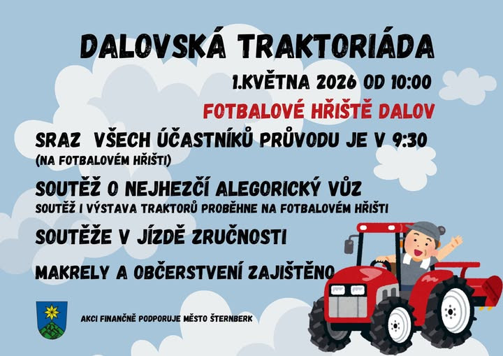 Srdečně zveme všechny milovníky traktorů na Dalovskou traktoriádu, která se letos uskuteční v pátek 1. května 2026.