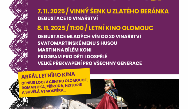 V sobotu 8. listopadu od 11 hodin se oslavy přesunou do areálu Letního kina Olomouc, který nabídne prostorné zázemí, pódium i amfiteátr. Na návštěvníky čeká 20 vinařství z celé Moravy, degustace mladých vín ročníku 2025, bohatý doprovodný program a zázemí pro rodiny s dětmi.
