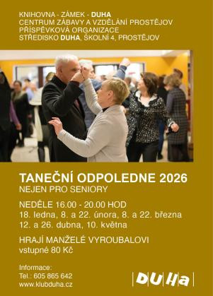 Taneční odpoledne pro seniory. Hrají manželé Vyroubalovi. Vstupné 80 Kč. Informace: 605 865 642, www.klubduha.cz. Datum konání: 18.1.2026 od 16:00 do 20:00 hodin / 8.2.2026 od 16:00 do 20:00 hodin / 22.2.2026 od 16:00 do 20:00 hodin / 8.3.2026 od 16:00 do 20:00 hodin / 22.3.2026 od 16:00 do 20:00 hodin / 12.4.2026 od 16:00 do 20:00 hodin / 26.4.2026 od 16:00 do 20:00 hodin / 10.5.2026 od 16:00 do 20:00 hodin