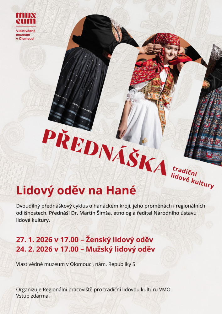 Dvoudílný přednáškový cyklus odhalí krásu a historii hanáckého kroje, jednoho z nejvýraznějších projevů tradiční lidové kultury na Hané. Oba večery povede Dr. Martin Šimša, přední český etnolog a ředitel Národního ústavu lidové kultury, který se lidovému oděvu věnuje dlouhodobě jak odborně, tak s osobním zaujetím. Vstup zdarma. Úterý 27. ledna 2026 od 17:00 – ženský lidový oděv Úterý 24. února 2026 od 17:00 – mužský lidový oděv