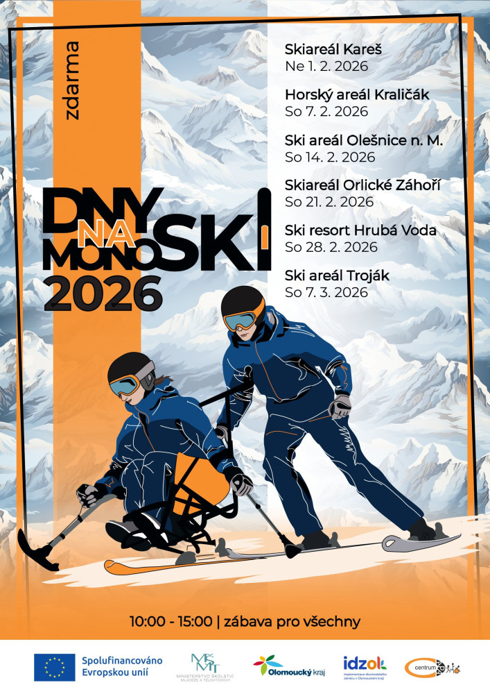 Seriál osvětových aktivit pořádaných Regionálním Centrem APA Olomouckého kraje. První zastávka bude 1.2. ve Ski areálu Kareš. Hned následující víkend 7. 2. zavítáme do Ski areálu Kraličák a na konci února budete mít možnost seznámit s lyžováním na monoski nebo bisky ve Ski areálu Hrubá Voda dne 28. 2. Kromě areálů v Olomouckém kraji navštívíme i některá tradiční místa mimo náš kraj viz plakát. Celodenní lyžování na mnoski je pro účastníky zdarma, je primárně určené pro sedící lyžaře, ale zájemci mohou být i z řad stojících lyžařů.