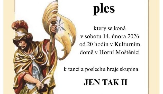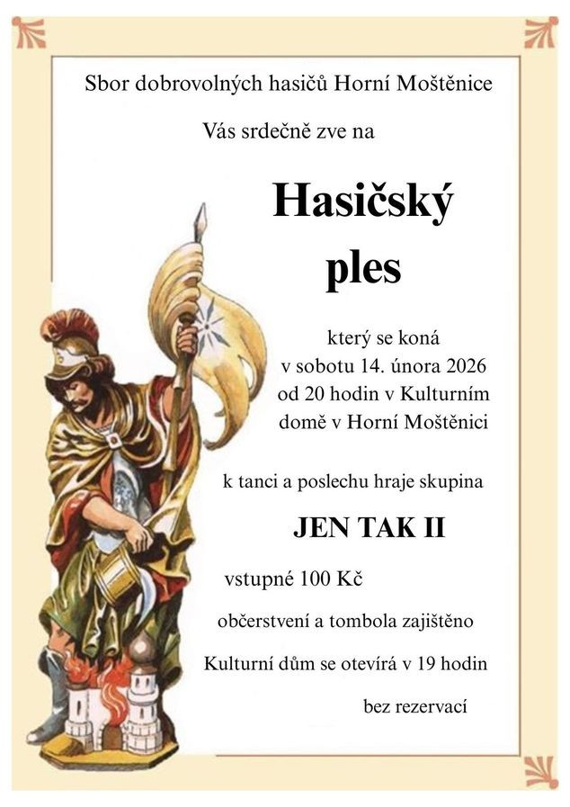 Hasičský ples v Horní Moštěnici na Přerovsku. Hraje hudební skupina Jen Tak II. Kulturní dům Horní Moštěnice. Vstupné: 100,- Kč. Tombola, občerstvení.