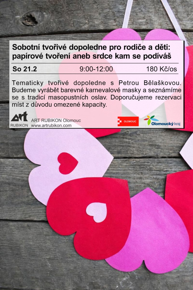 Tematicky tvořivé dopoledne s oblíbenou lektorkou Petrou Bělaškovou. Tématem je papírové tvoření na spousty různých způsobů. Doporučujeme rezervaci míst z důvodu omezené kapacity.