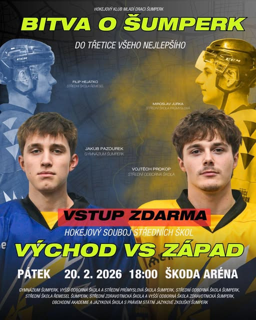 Třetí ročník největší sportovní akce v regionu ve znamení Východu proti Západu. Tradiční hokejový souboj letos přichází s novým formátem. V atraktivním duelu se střetnou týmy Východu a Západu, složené ze studentů šumperských středních škol a hráčů HK Mladí Draci Šumperk. Akci doplní doprovodný program, partnerská zóna a soutěže.