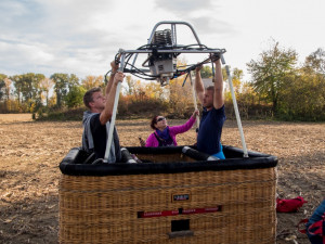 Příprava od příjezdu na místo startu až po vzlétnutí trvá asi tři čtvrtě hodiny a po celou dobu mi Janko ochotně vysvětluje, co všechno je potřeba udělat, abychom se dostali do vzduchu. Brzy jsem pochopil, že to nebude jen tak, že nestačí nastoupit do koše a nechat se unášet horkým vzduchem. Janko do přípravy zapojil téměř všechny přítomné muže. „Dělám to tak u každého letu, tohle není výjimka, chlapi se navíc většinou rádi přidají,“ usmívá se. Můžu potvrdit, že i u mě se dostavil příjemný pocit chlapáctví z toho, že jsem mohl přidat ruku k dílu.
