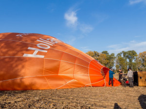 Když se s Jankem motám kolem koše, další chlapi roztáhli balón na pole, což není úplně ideální povrch. „Ideální pro balón je startování z trávy, bez nějakých kamínků nebo bodláků. A co se týká místa, tak to startuju z míst, kde mám povolení majitele pozemku.“ Místo přistání však často ovlivnit nelze, a tak pilot může s balónem přistát vlastně kdekoliv.