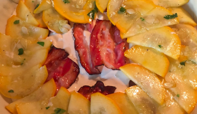 Jako první si dejte do trouby vypéct plátky slaniny do křupava. Cuketu si nakrájejte na tenčí kolečka, v míse promíchejte s najemno nasekaným česnekem, olivovým olejem, solí, pepřem a nechejte chvíli odpočívat, ať se chutě propojí. Mascarpone smíchejte se dvěma vejci a větší půlkou nastrouhaného parmazánu, osolte a opepřete. Kdo chcete, můžete přidat např. nasekanou bazalku nebo bylinky dle chuti. Připravte si křehké těsto do kulaté koláčové formy. Rovnou se přiznám, že my kupujeme hotové, stačí ho rozvinout, protože už je rovnou na pečícím papíře a je hotovo. Kdo jste nadšenci a máte čas, můžete si samozřejmě připravit doma vlastní. Těsto na pár místech propíchejte vidličkou, nebude se vám zvedat a dělat bubliny. Potřete směsí mascarpone a vajec se sýrem, přidejte slaninu a začněte pokládat kolečka cukety, pěkně jedno po druhém. Jakmile budete mít hotovo, dejte péct do trouby vyhřáté na 200°C na cca čtvrt hodiny, pak posypte zbývajícím parmazánem a nechejte dopéct dozlatova. Podávat ho můžete teplý i studený, obě varianty jsou skvělé.