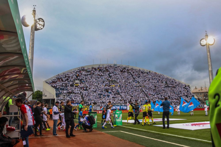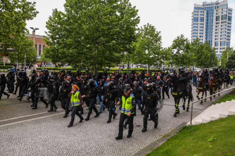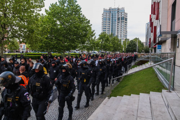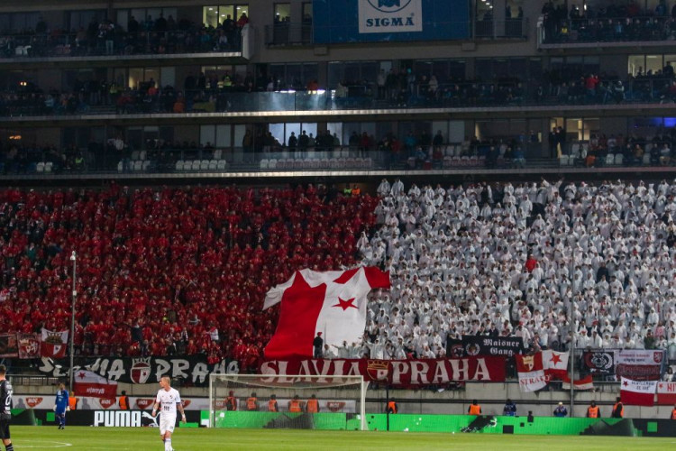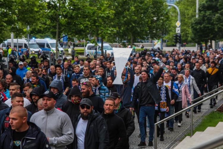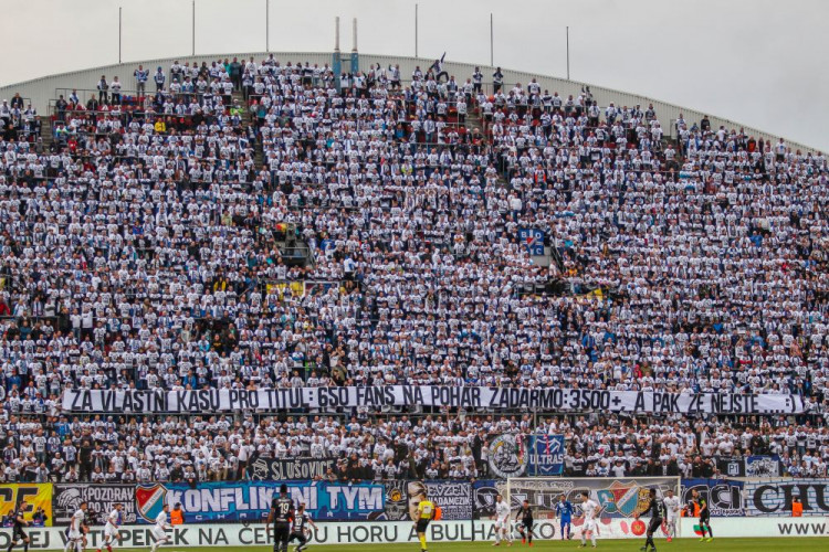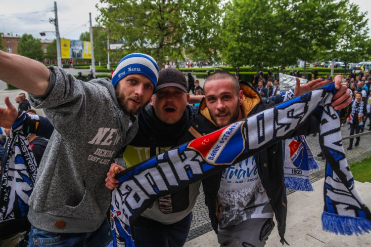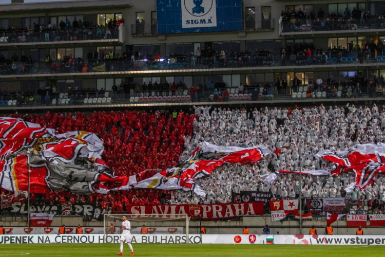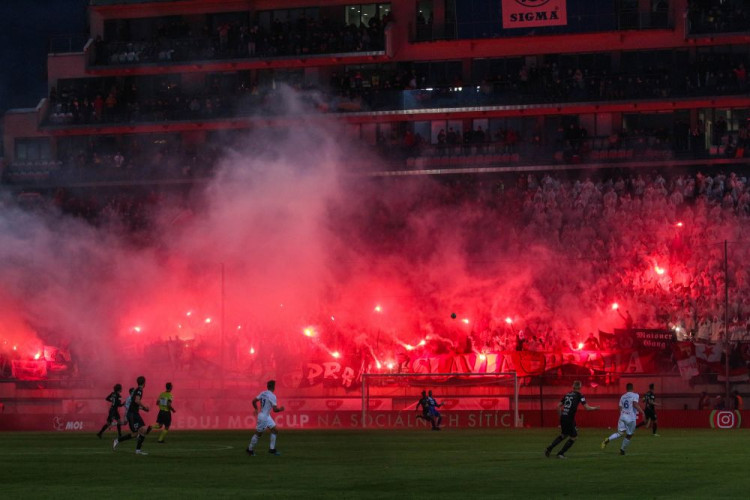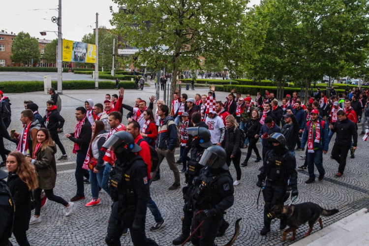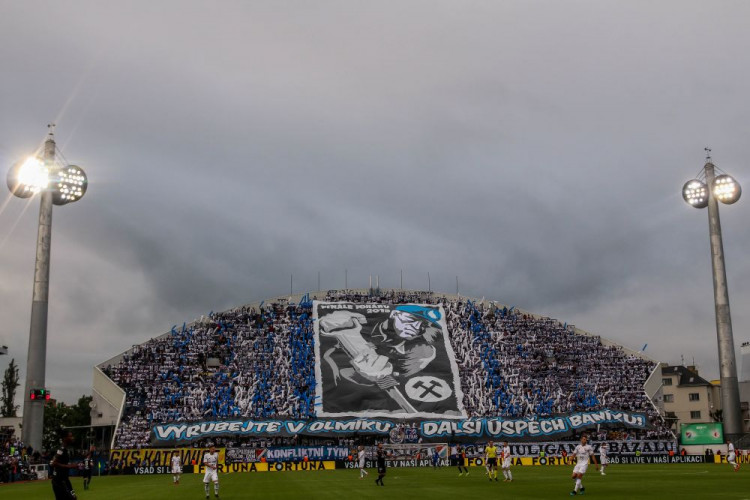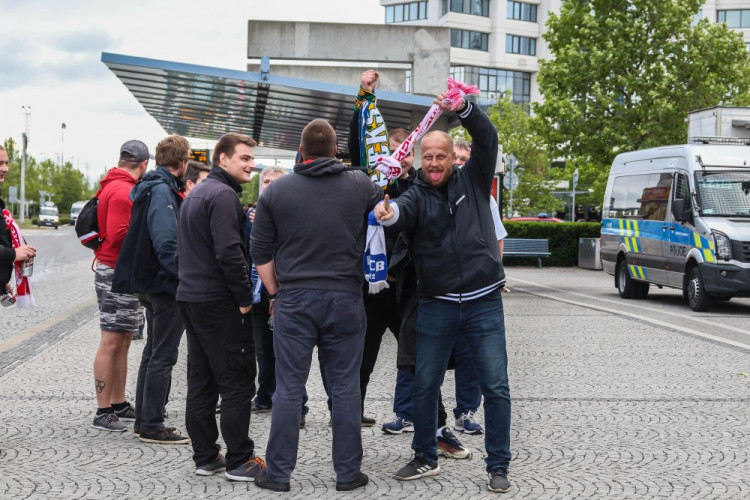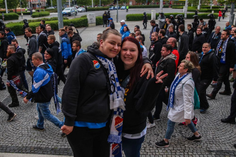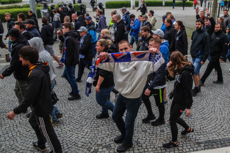 FOTOGALERIE/VIDEO: Pochod městem i povedená chorea. Fanoušci Slavie a Baníku obsadili Olomouc