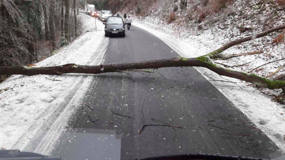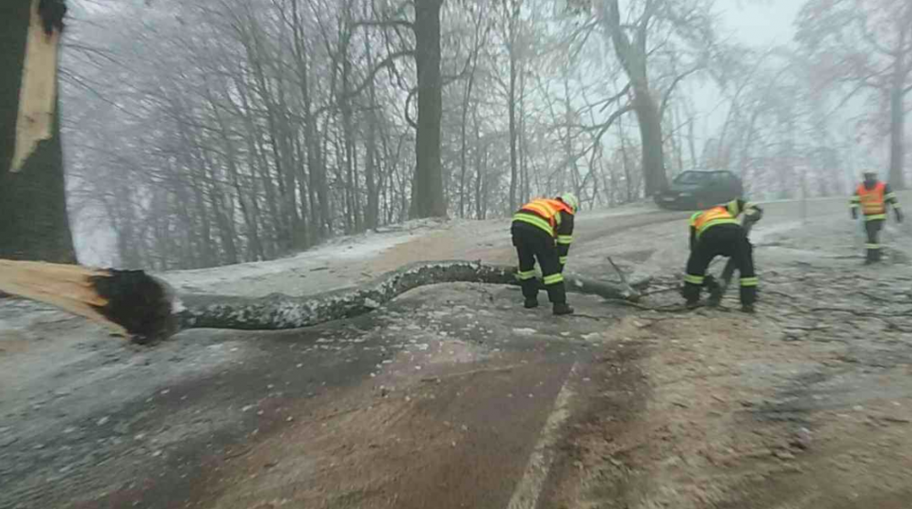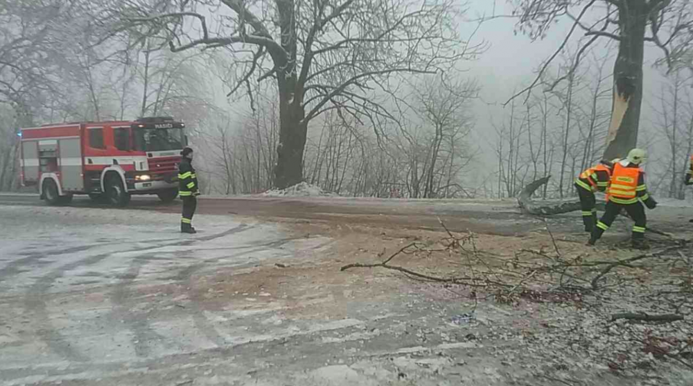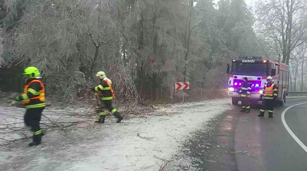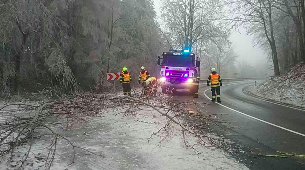 FOTO: Hasiči od oběda vyjížděli v kraji už k osmi popadaným stromům, na vině je tíha ledové krusty na nich