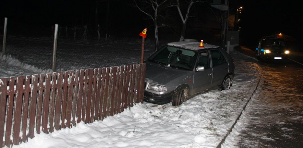 Opilý řidič nezvládl na letních gumách zatáčku a skončil v oplocení domu