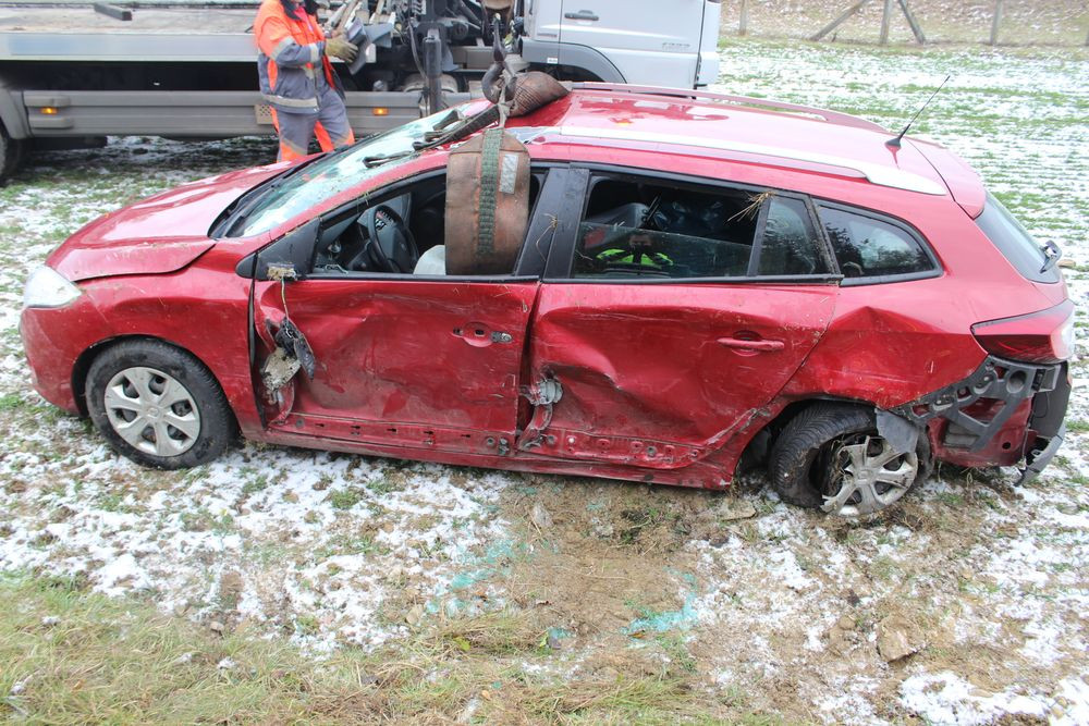 FOTO: Řidička přejela do protisměru, kde narazila do protijedoucího auta. To skončilo v poli převrácené na střechu