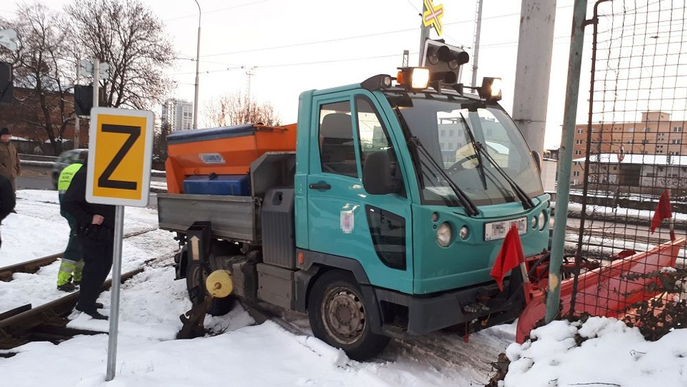 Při odklízení sněhu uvízl řidič multikáry na železničním přejezdu. Provoz na trati byl zastaven
