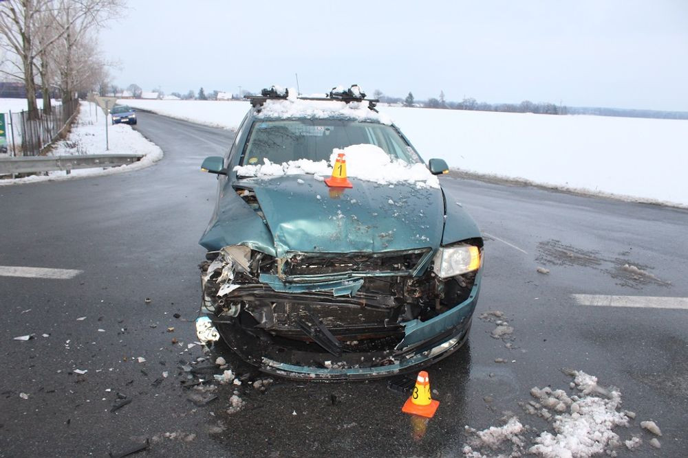 FOTO: Řidič škodovky přehlédl dopravní značku a nedal přednost v jízdě. Došlo ke srážce aut a zranění řidiče