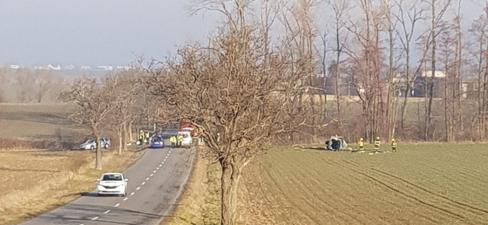 Řidič skončil s autem daleko v poli. Do nemocnice ho ve vážném stavu transportoval vrtulník