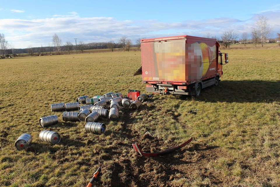 FOTO: Řidiči náklaďáku vjela do cesty žena v osobním autě, skončil s rozsypaným nákladem piva v poli