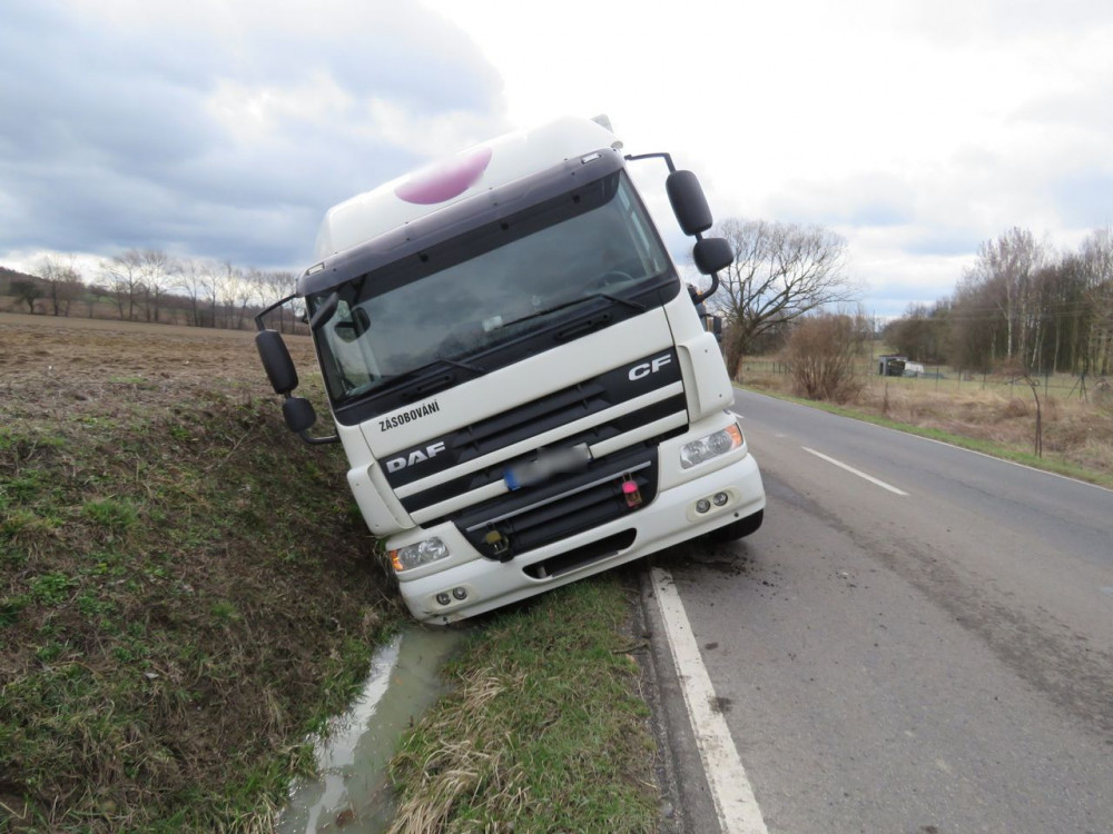 Řidič náklaďáku se během jízdy natáhl pro dokumenty. Kvůli chvilce nepozornosti skončil v příkopu