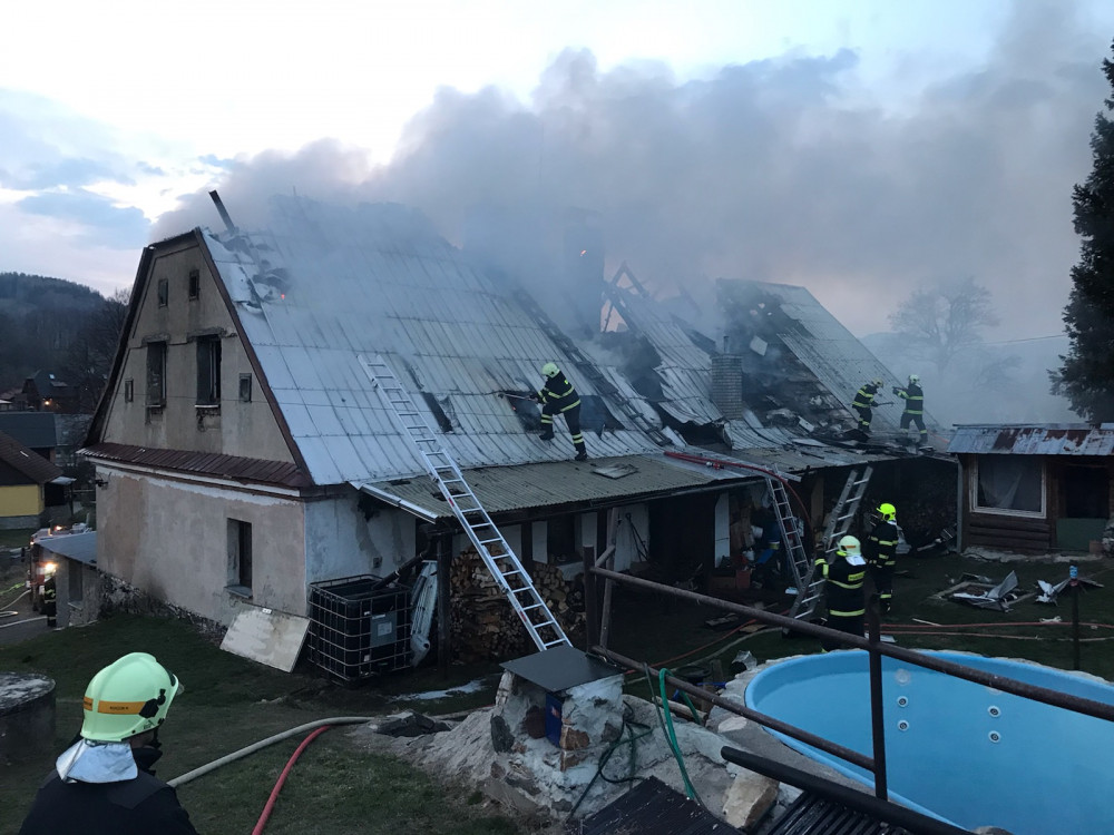 FOTO/VIDEO: V Domašově hořela střecha rodinného domu. Požár napáchal velkou škodu a dům je zcela poškozen