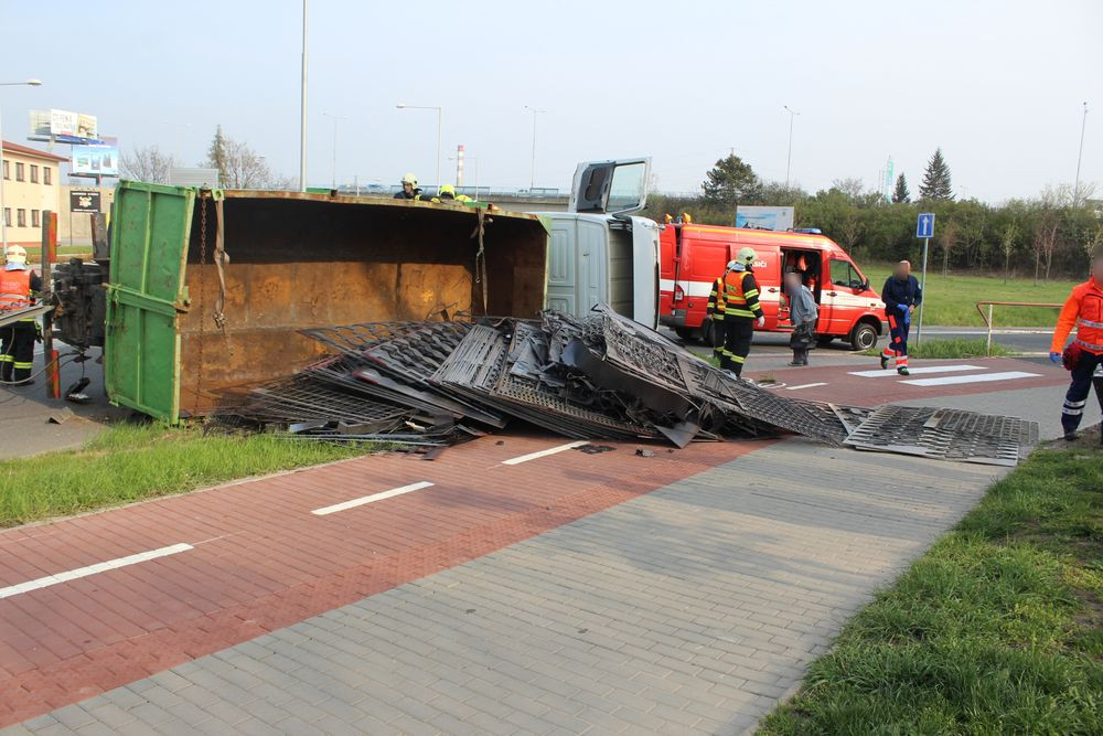 Na křižovatce havaroval náklaďák vezoucí železný šrot. Ten se vysypal na cyklostezku a chodník