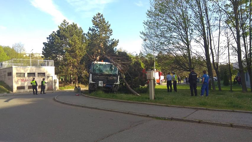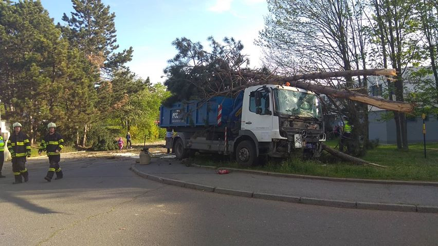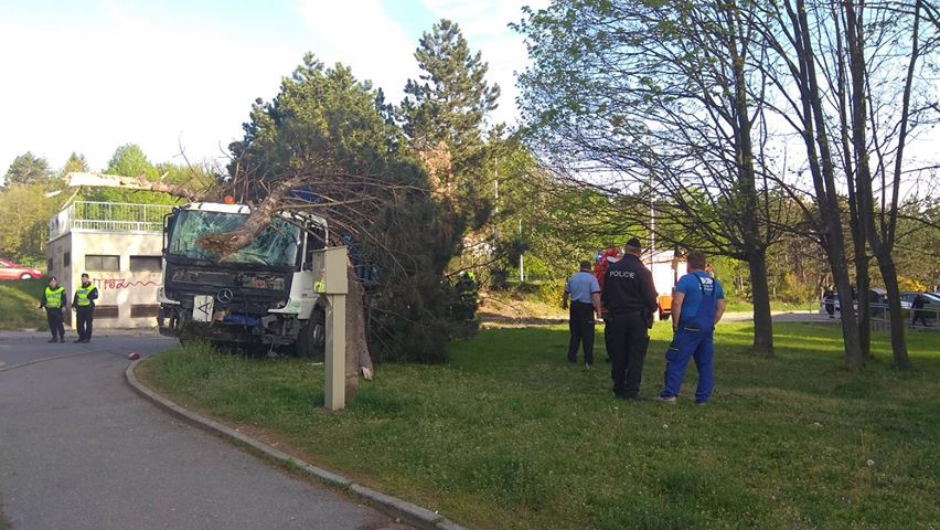 FOTO: Náklaďák v Brněnské ulici prorazil zábradlí, projel přes koleje a skončil na vedlejší ulici ve stromě