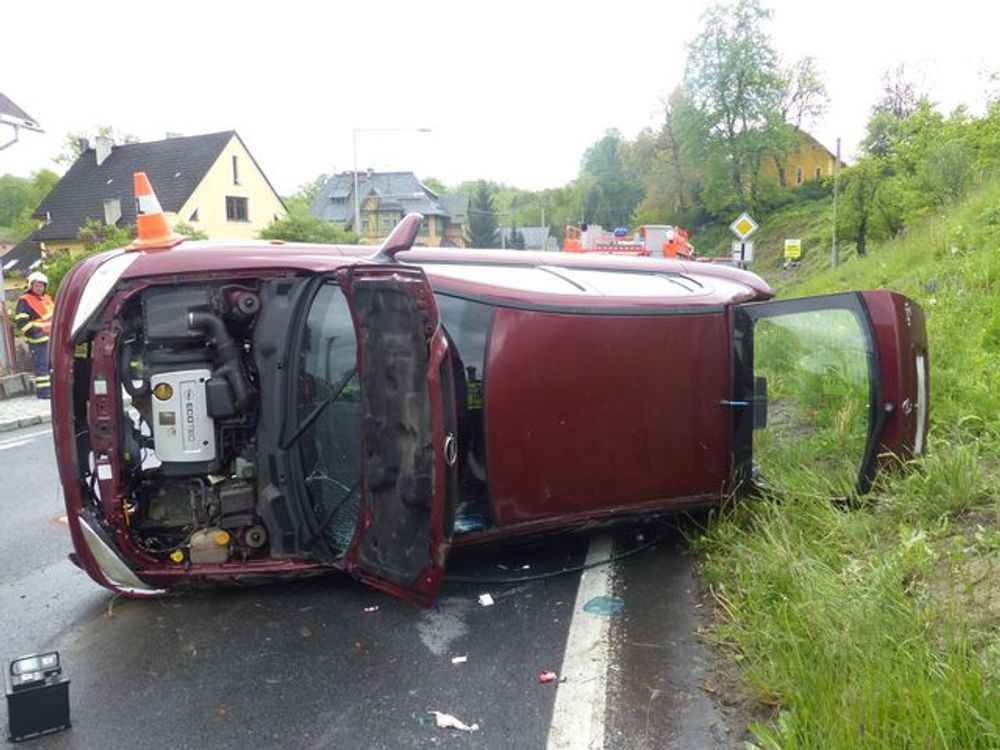 Mladá řidička se v zatáčce lekla protijedoucího náklaďáku a strhla volant. Na mokré silnici dostala smyk a auto se převrátilo na bok