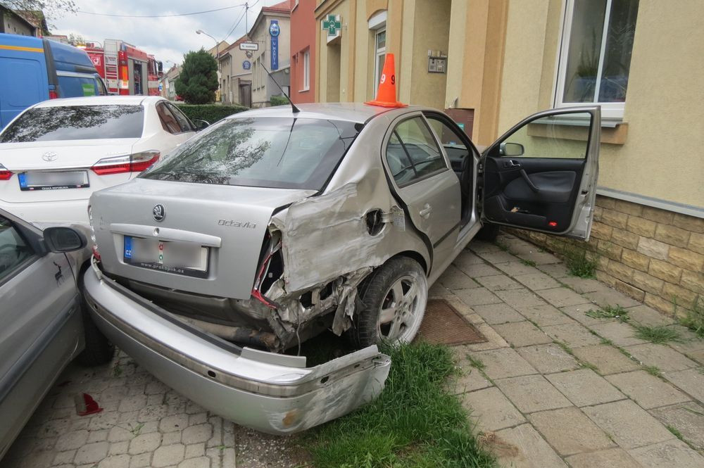 FOTO: Řidič jel příliš rychle. Po smyku narazil do dvou domů a auta
