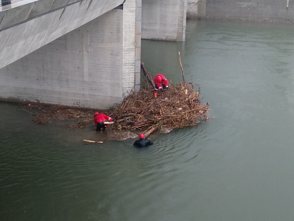 FOTO: I přes neustálý déšť strážníci čistí mostní pilíře od nánosů naplavených větví a odpadu