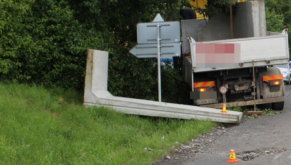 Z nákladního auta vypadl betonový panel. Poškodil silnici i travnatý příkop