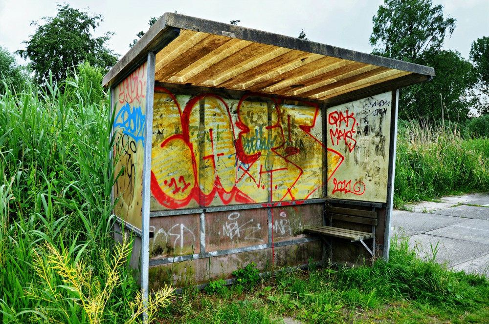 Vandal nasprejoval nápisy na autobusové zastávky u Nákla. Fialovým sprejem napáchal škodu za tisíce