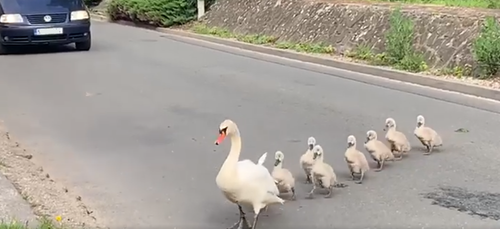 VIDEO: Labutě se potřebovaly dostat k rybníku. Řidiči kvůli nim zastavili