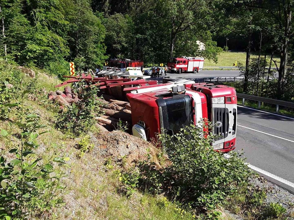 FOTO: Řidič nezvádl svůj kamion a s nákladem dřeva ho převrátil na bok