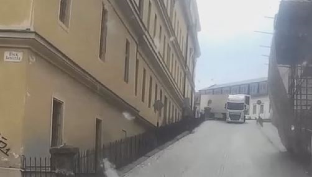 VIDEO: Řidič kamionu nevytočil zatáčku v centru Olomouce. Poškodil pilíř a rozvodnou skříň