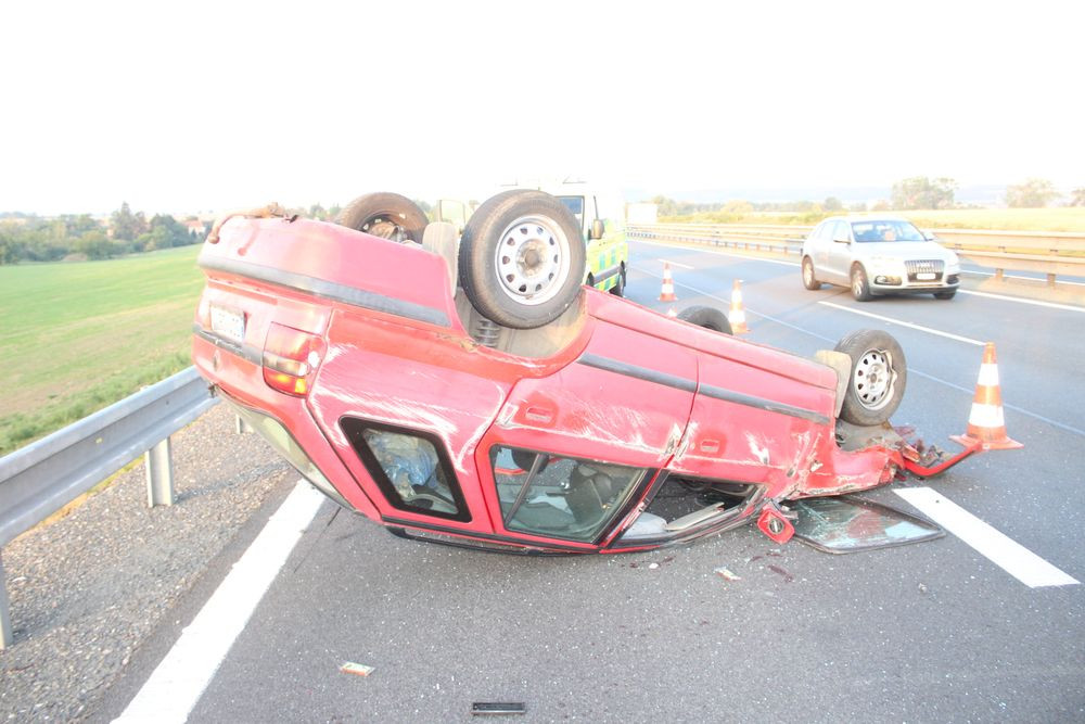 Řidič dnes ráno usnul na dálnici. Po nárazu do svodidel se auto převrátilo na střechu