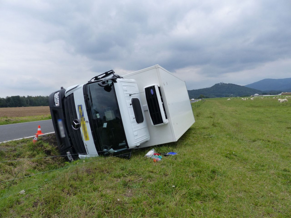 Třiadvacetiletý řidič najel s kamionem na krajnici, která se utrhla. Vozidlo skončilo na boku