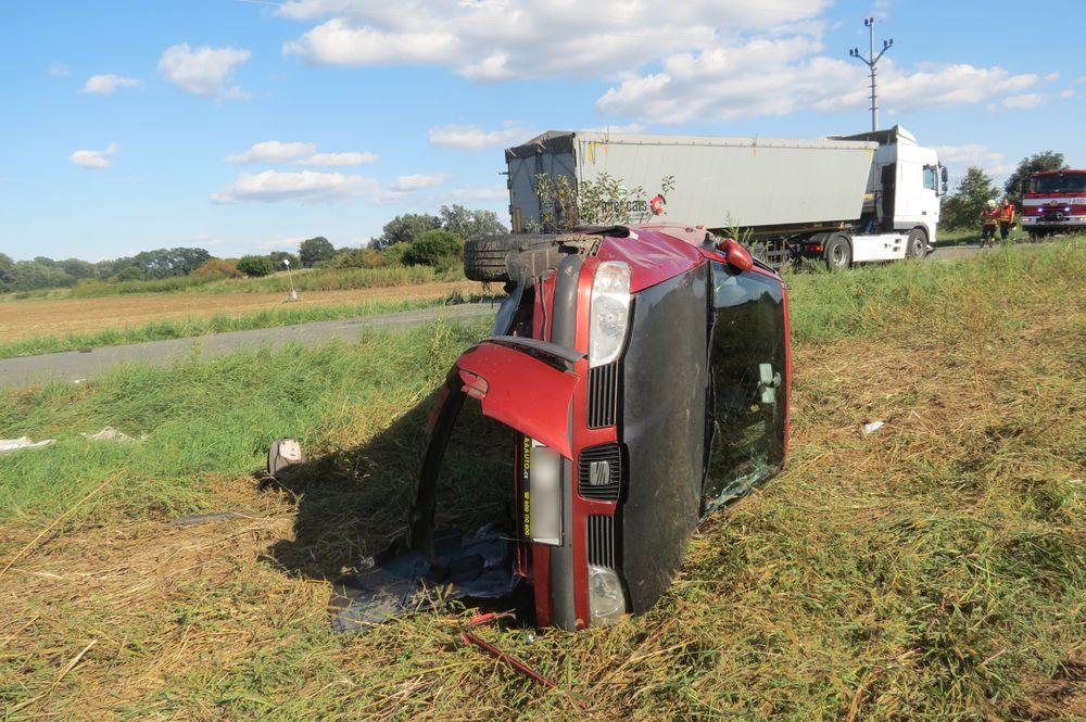 Řidič náklaďáku přehlédl pomalu jedoucí osobák a narazil do něj. Jeho řidička skončila v převráceném voze na poli