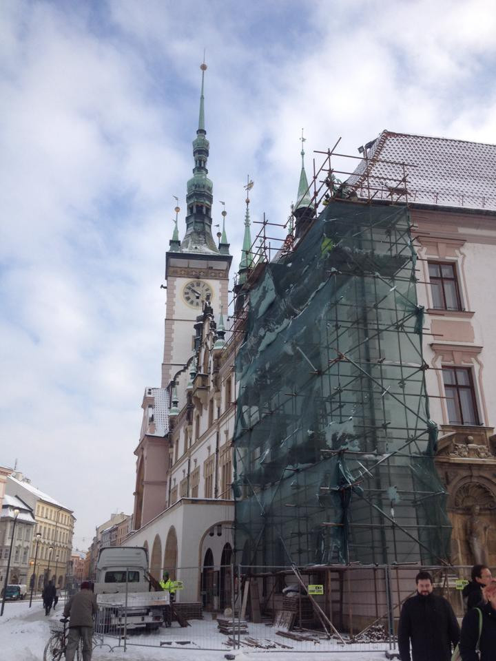 Opilý muž a žena vylezli na lešení u olomoucké radnice. Skončili na záchytce