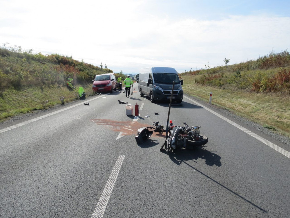 Motorkář se díval do zpětného zrcátka a přehlédl auto s přívěsem před ním. Po nárazu upadl na silnici
