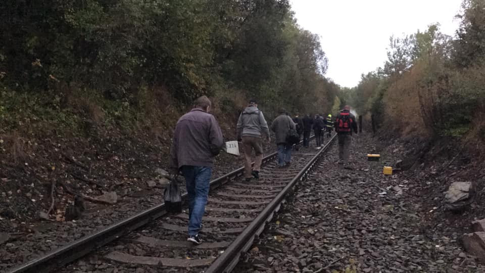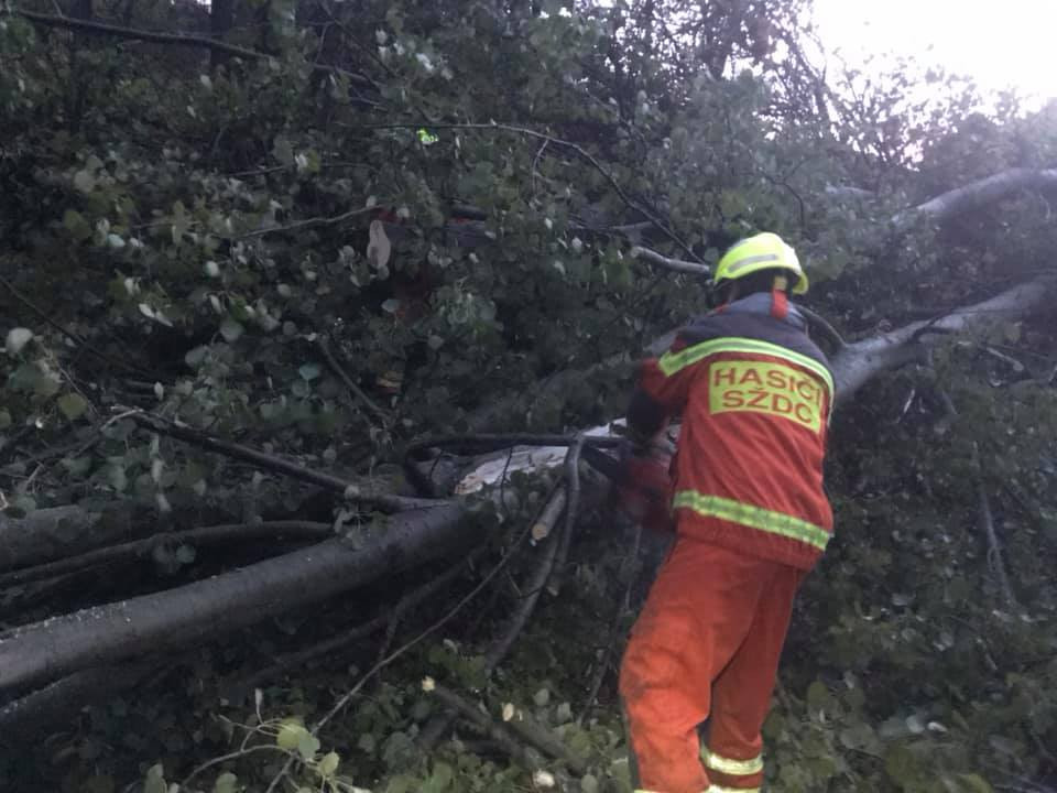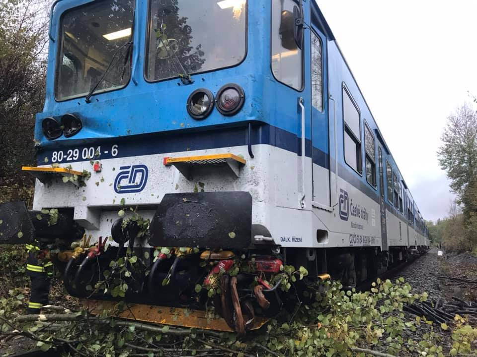 FOTO: Rychlík, ve kterém bylo přes třicet cestujících, narazil do sedmi popadaných stromů