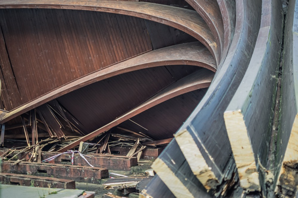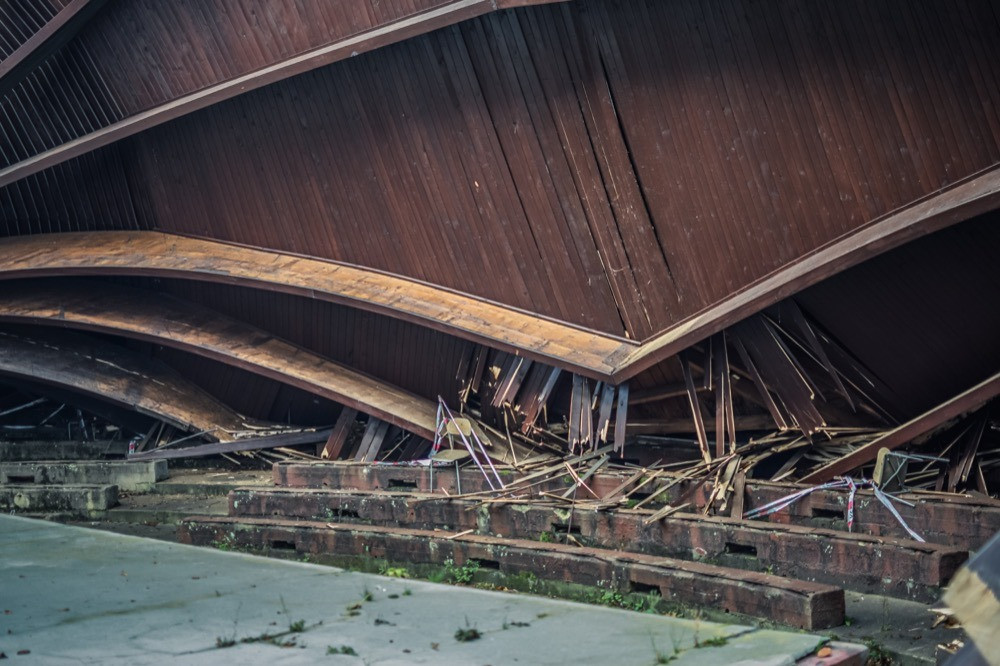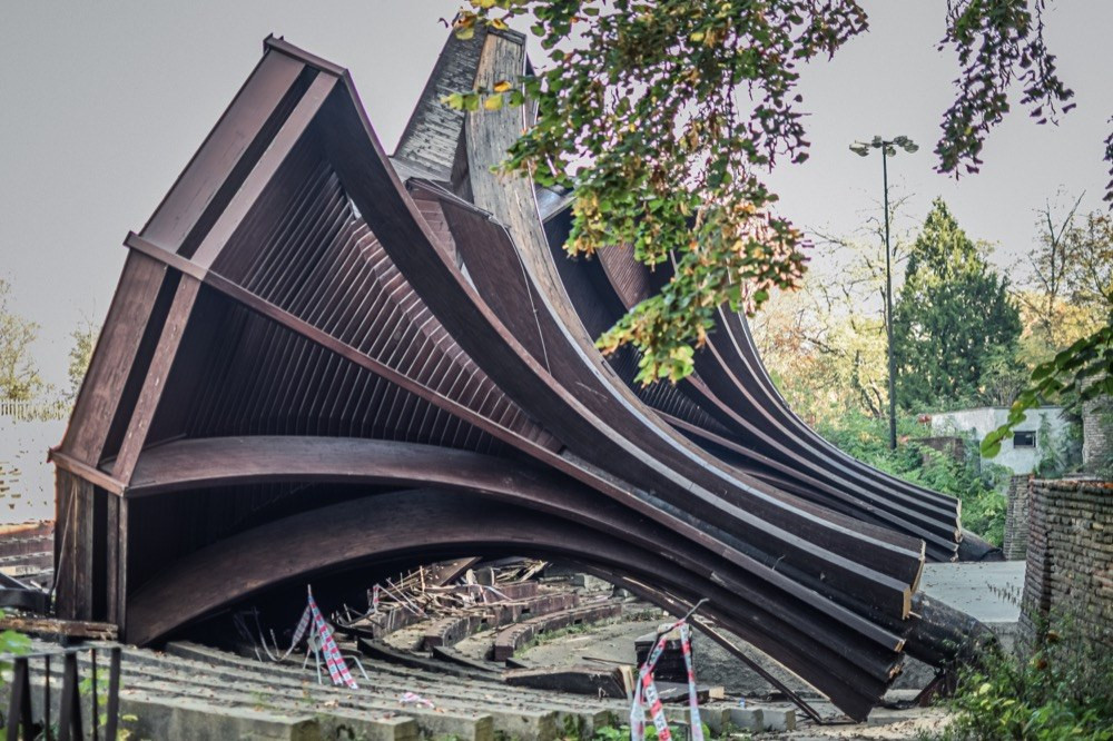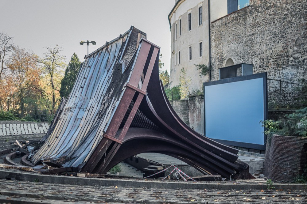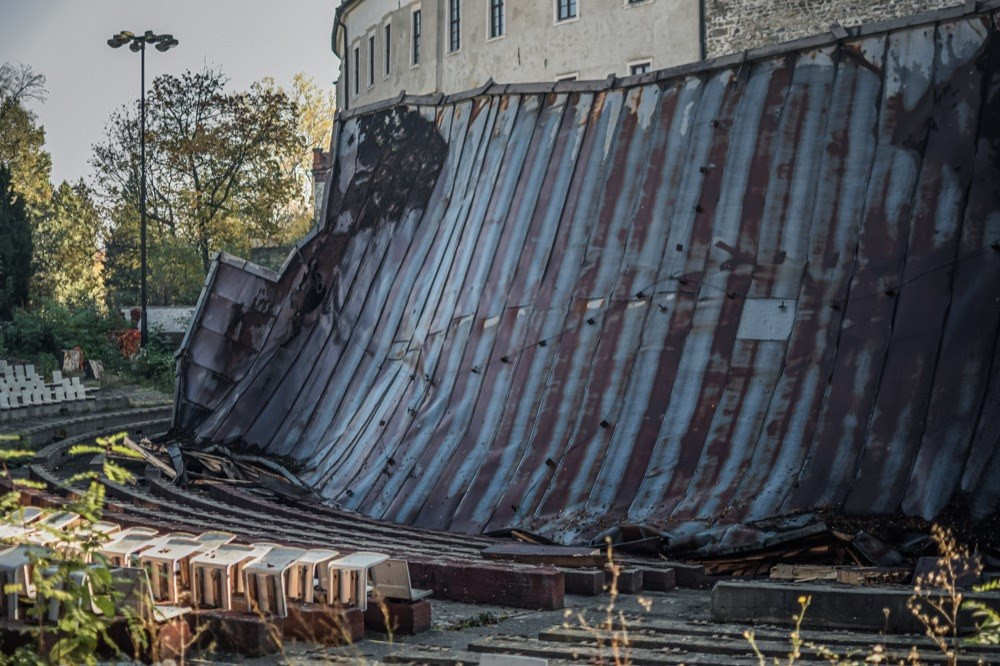 FOTO: Olomoucký letňák přišel o svou dominantu. Dřevěné zastřešení pódia šlo k zemi