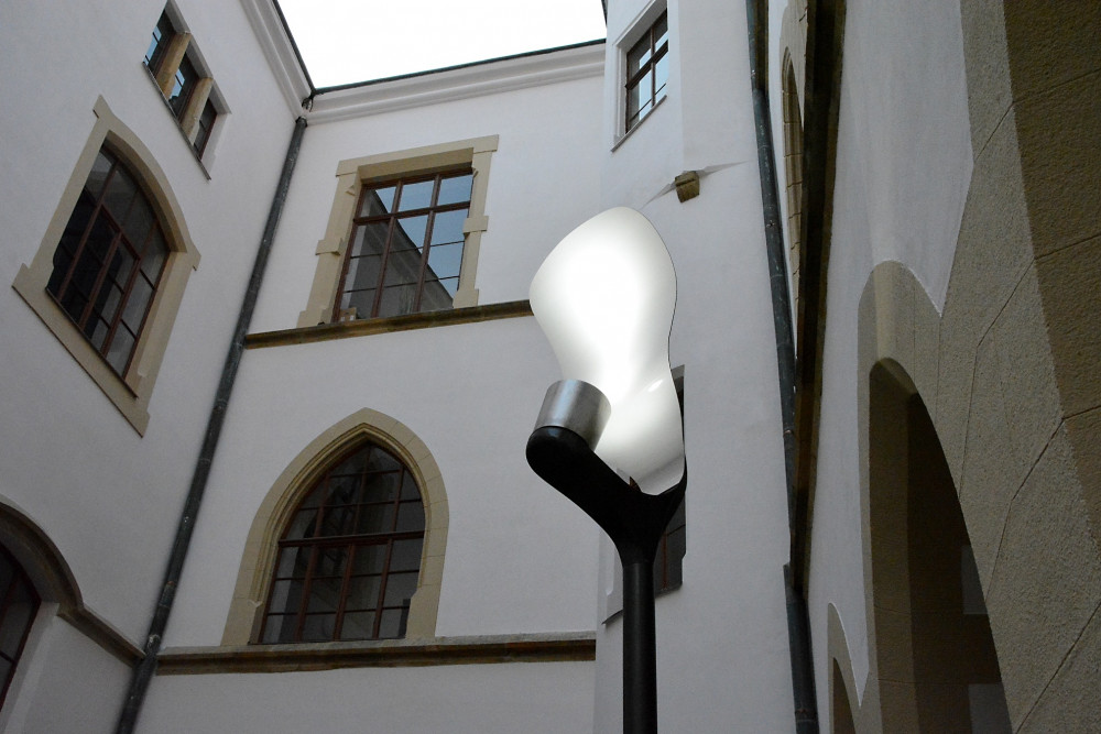 Olomouc zkouší nový prototyp lampy pro Horní náměstí. Je vystaven na nádvoří radnice