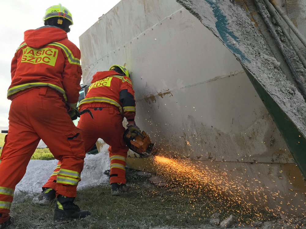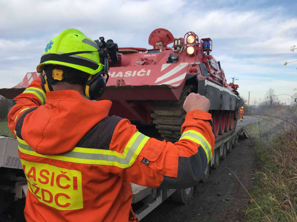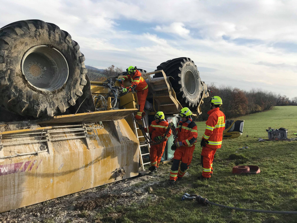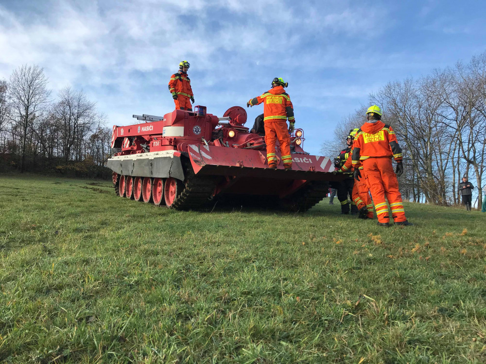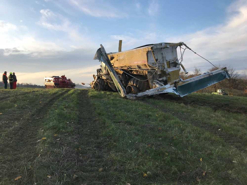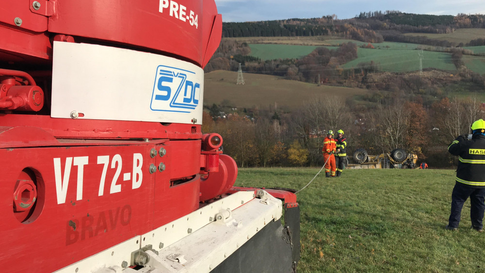 FOTO: U převráceného zemědělského stroje zasahovali hasiči s tankem