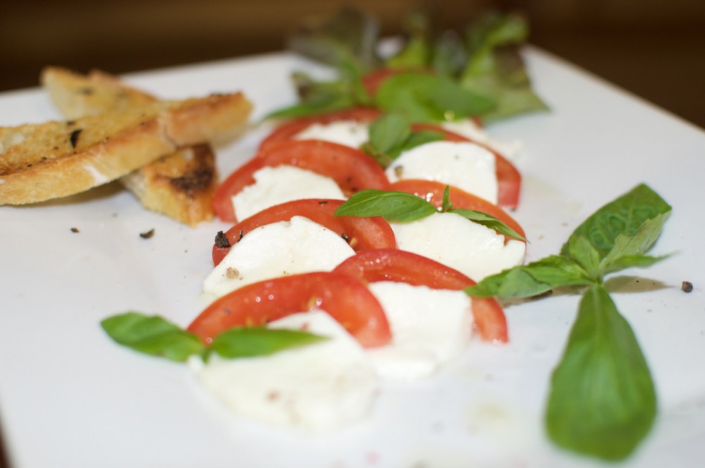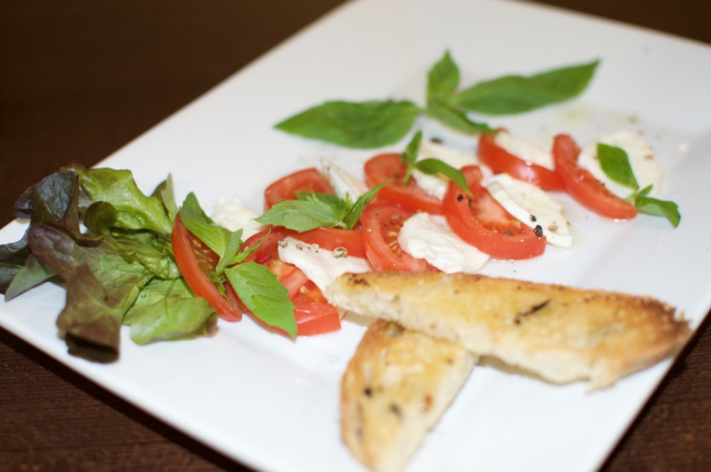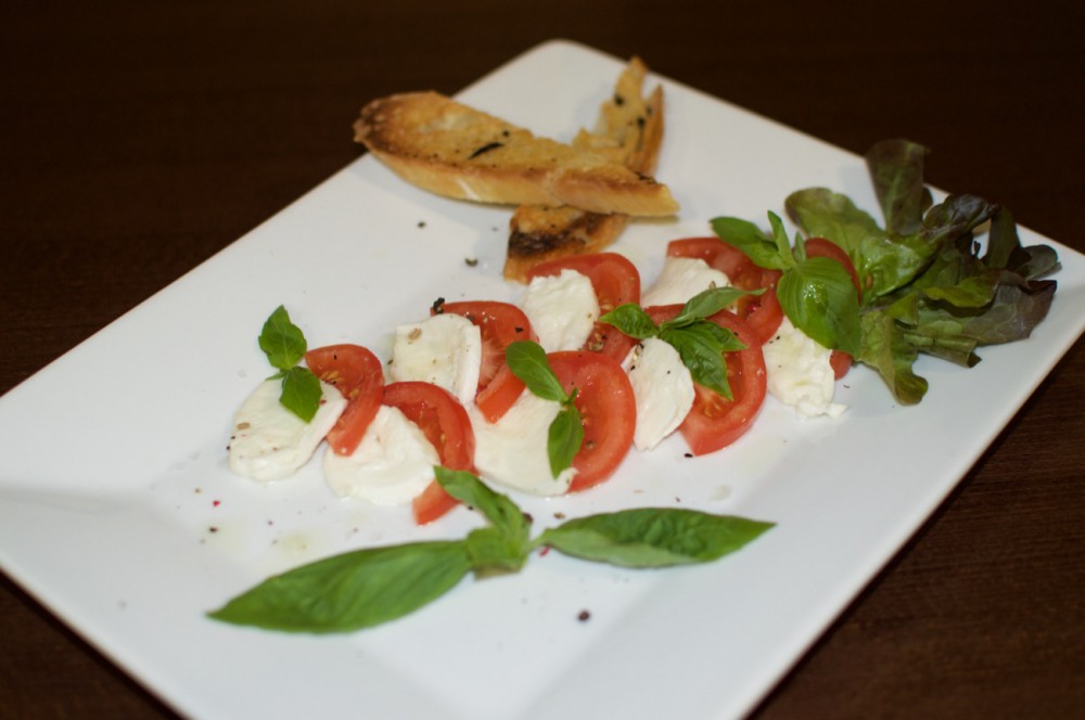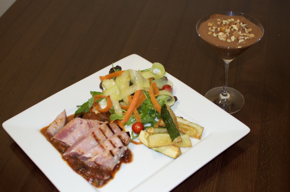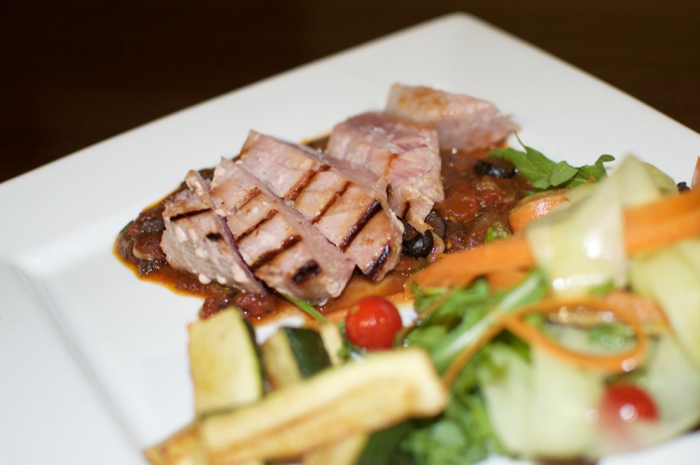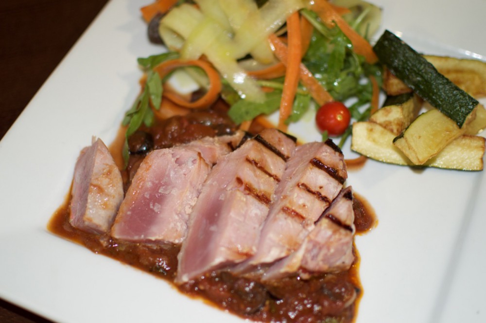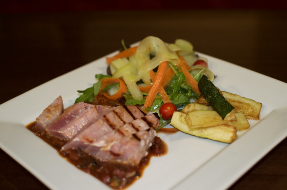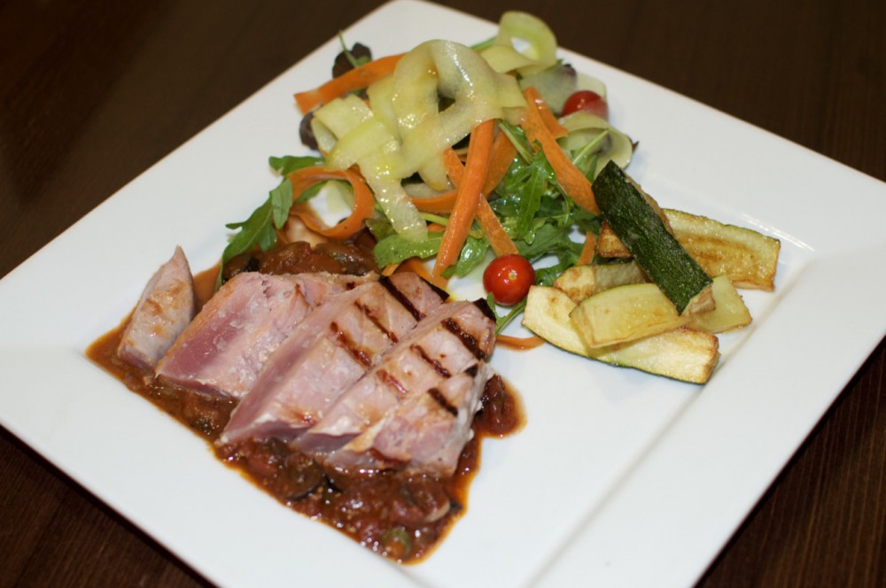 Grilovaný steak z čerstvého tuňáka s červeným vínem, kapari a olivovou omáčkou, cuketové hranolky a svěží míchaný salát