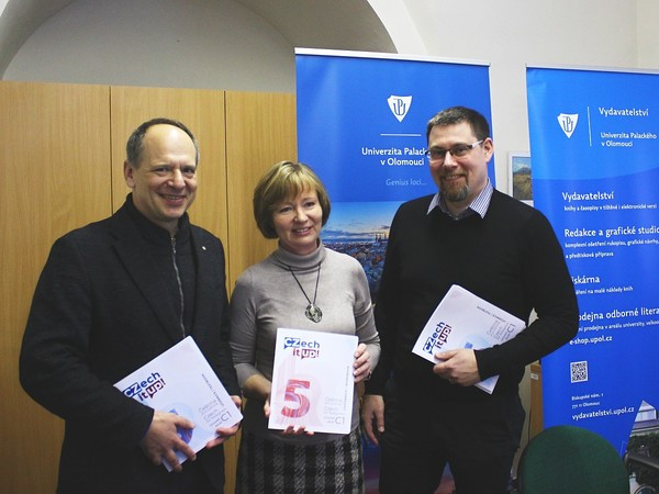 Novou učebnici představili prorektor Martin Kudláček, odborná garantka Darina Hradilová z katedry bohemistiky FF a ředitel Vydavatelství UP Aleš Prstek.