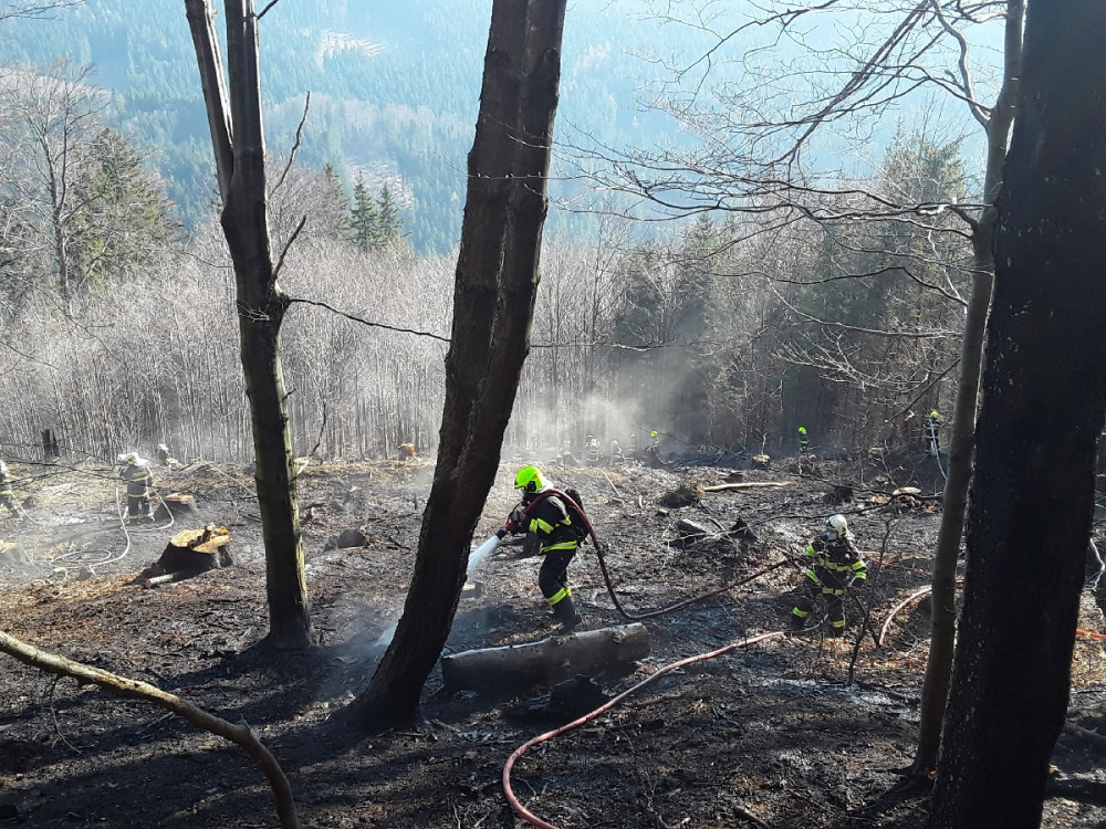 Požár lesa v Dětřichově, místní části Jeseníku, kde se tento týden v pondělí vymklo kontrole pálení klestí