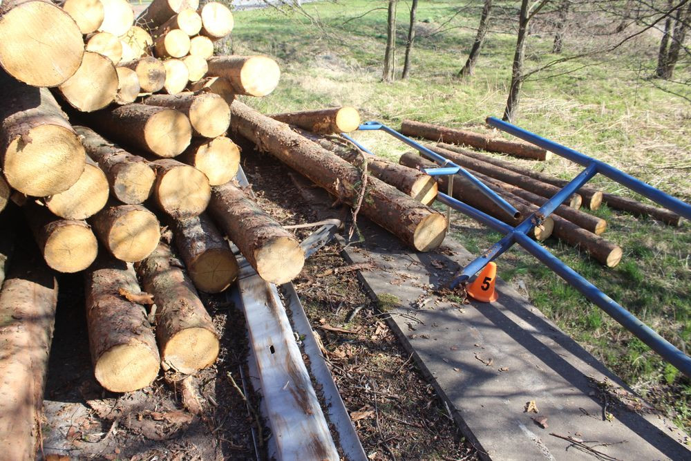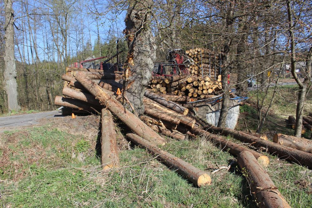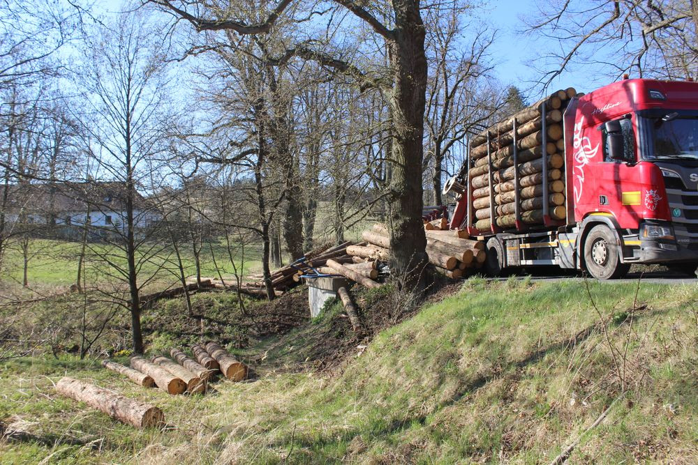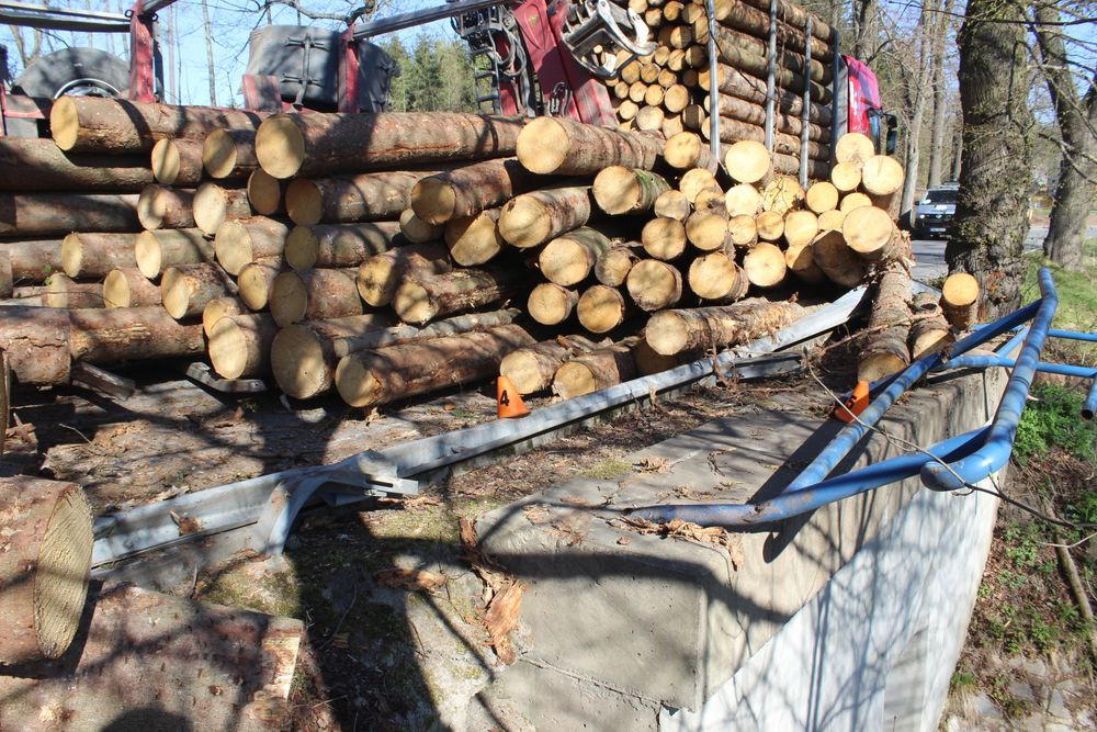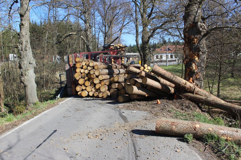 Řidič při projíždění zatáčkou převrátil přívěs s dřevěnými kládami