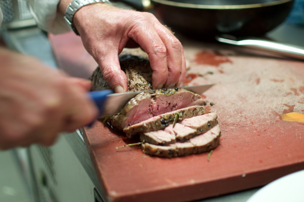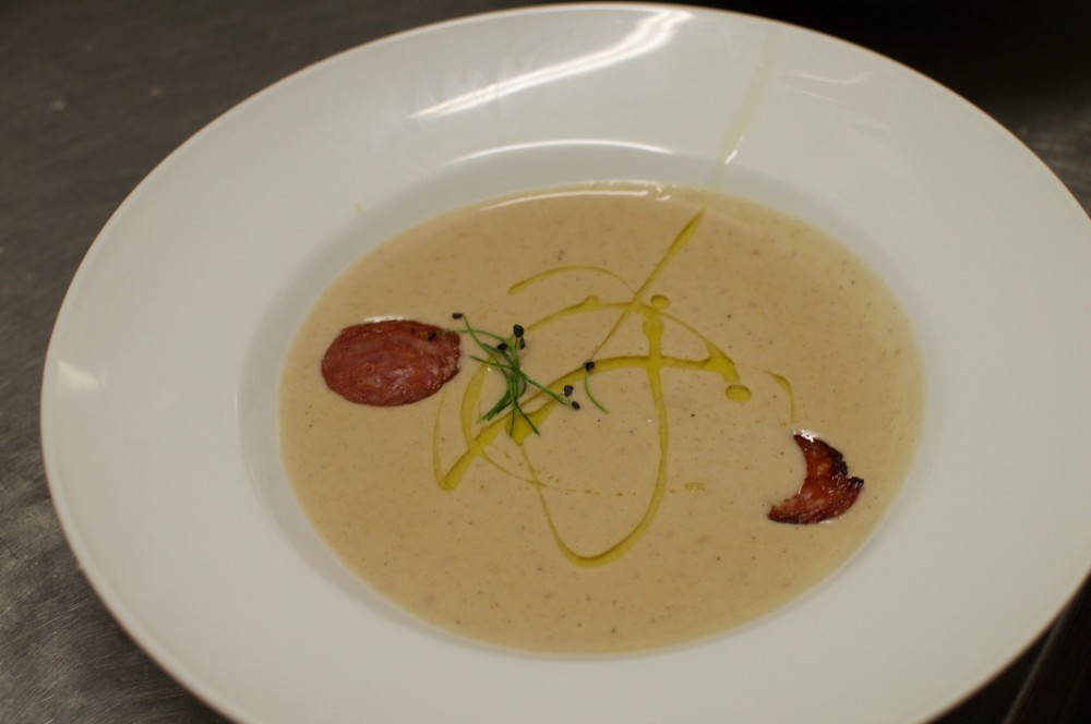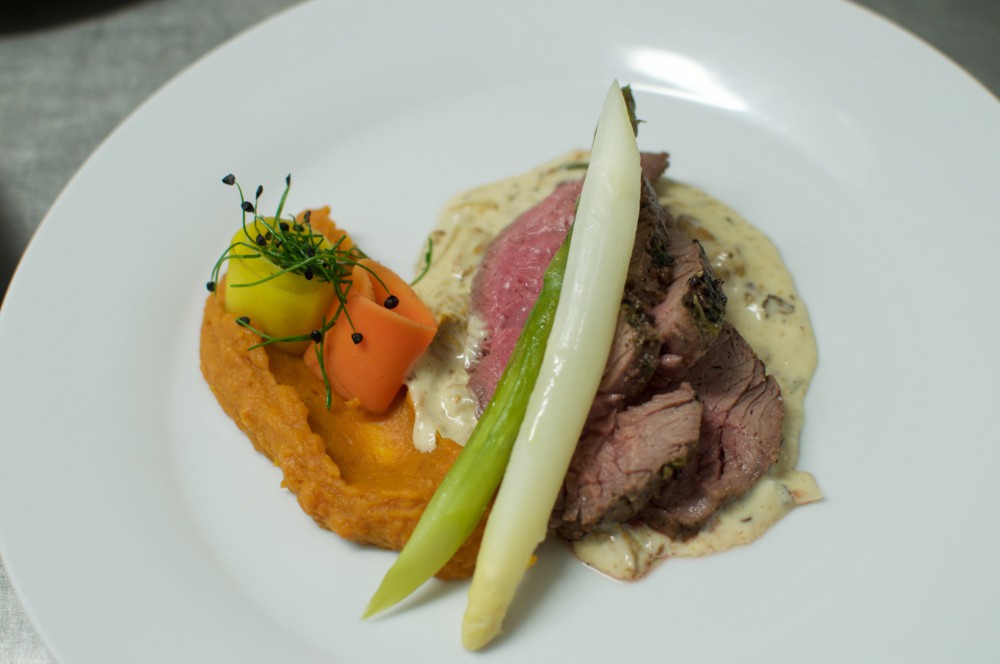 Pěněná svíčková na bylinkách s dýňovo-batátovým pyré, variací chřestu a omáčkou z čerstvých lišek