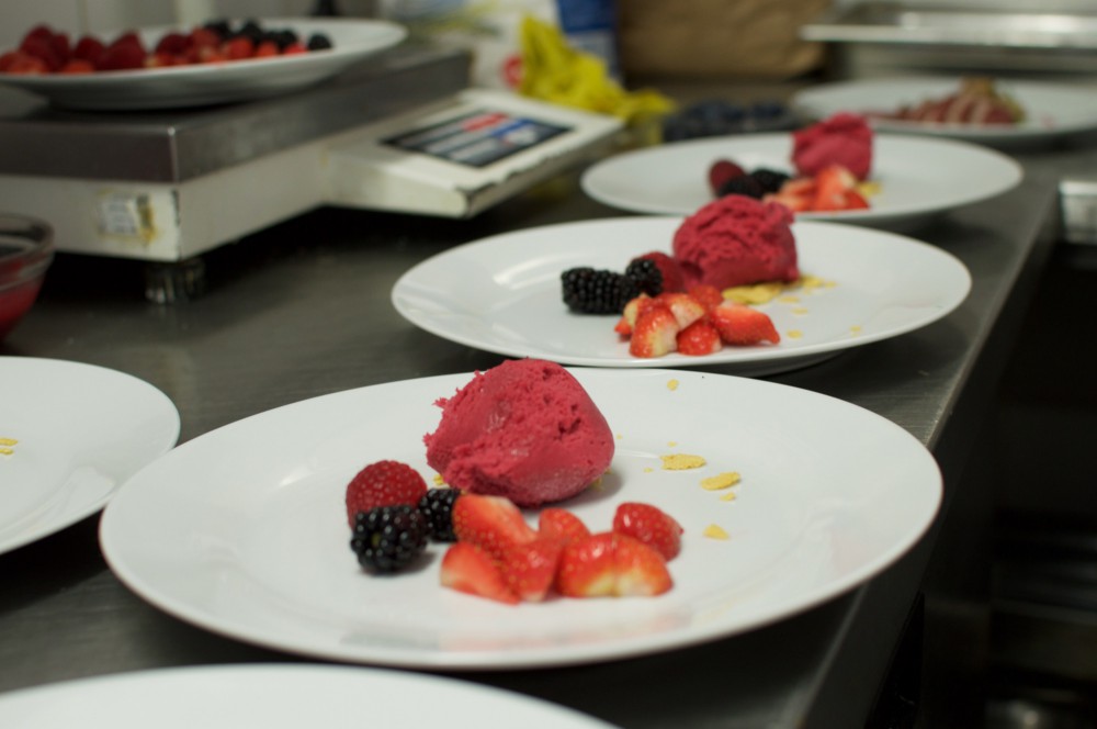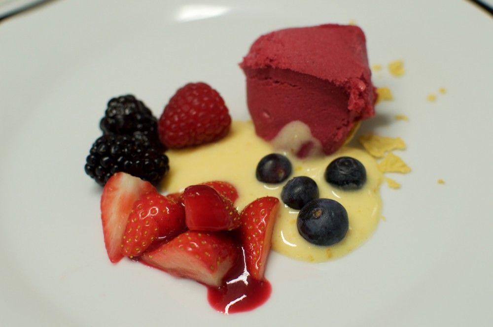 Sladká tečka na závěr v podobě čerstvého ovoce se sabayonem z ledového vína a malinovým sorbetem